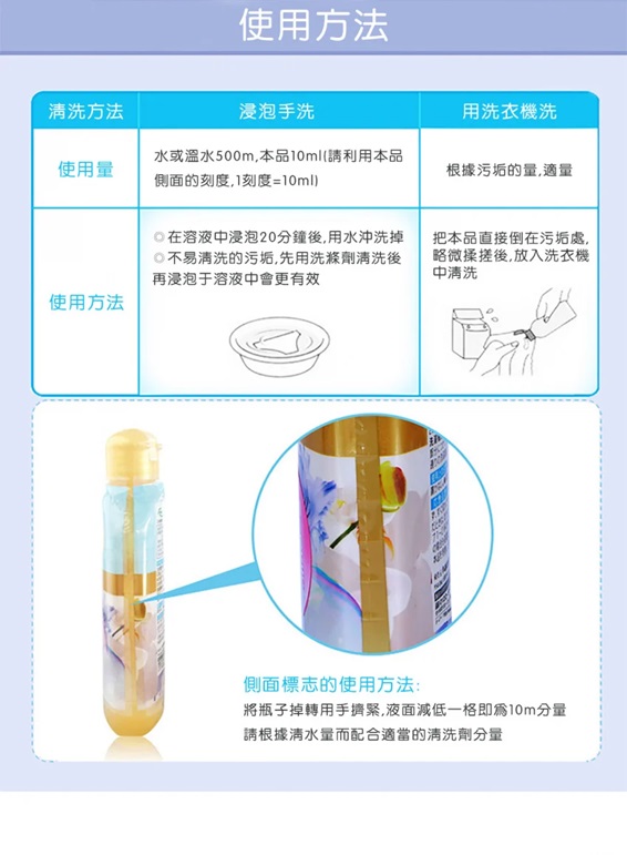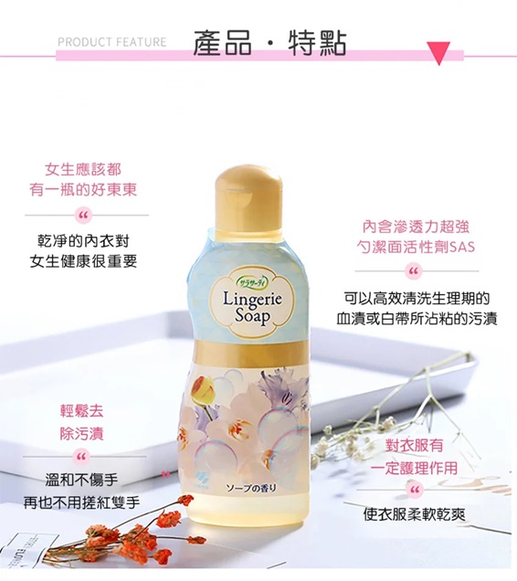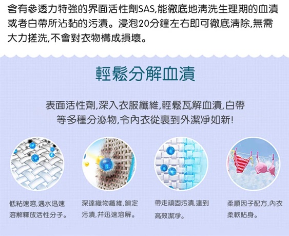 Features: Mild and slightly alkaline, deeply cleanses and removes stains, gentle care, no scrubbing required, simply soak for 20 minutes, specially formulated for menstrual periods, suitable for hand and machine washing.