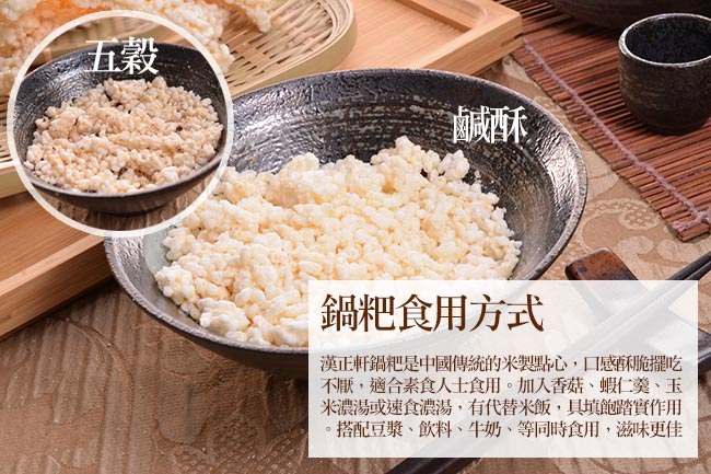特色介紹:《漢正軒》鍋粑為世界知名品牌之一,也是我們台灣人的驕傲,在全球風行近60餘年及出口多達20餘個國家及城市。是世界性知名品牌,您怎能錯過。不論男女、老少均可食用,更是早餐、點心、下午茶最佳的良伴。