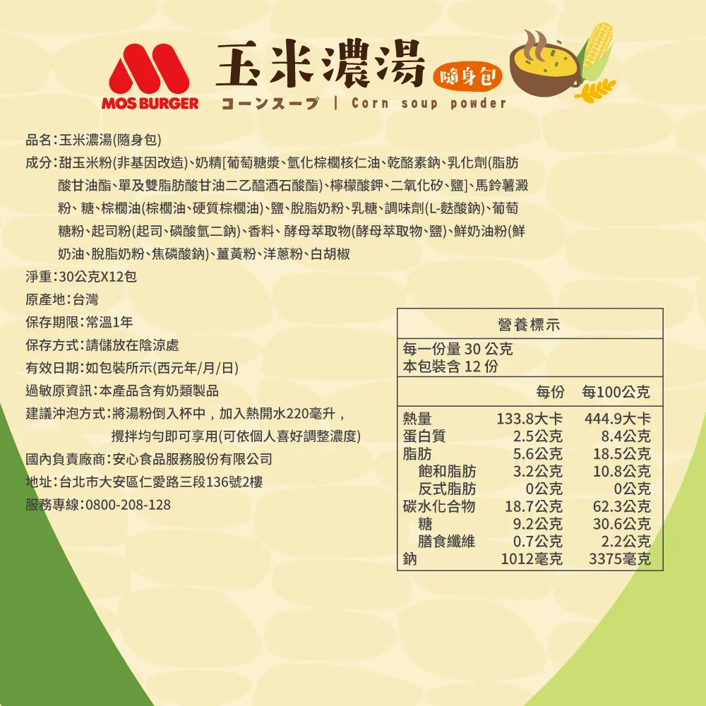 【MOS摩斯漢堡】玉米濃湯隨身包(12入/盒)【MOS Burger】Corn Chowder Travel Pack (12 packs/box)